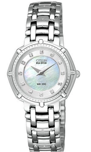 Inspired by the J-Class racing yachts of the 1930s, The Citizen Eco-Drive J-Class stainless steel women's watch offers an elegant nautically inspired design and a luxurious accent of 12 genuine diamonds that serve as the dial markers. This fully silver watch sports a round watch case that measures approximately 1 inch wide and is topped by a bezel that resembles a ship's wheel. The dial face features a center mother-of-pearl accent and small, silver baton hands. It's completed by a silver stainless steel bracelet band that mixes brushed and polished finishes and is joined by a push-button deployment clasp. Other features include a scratch resistant mineral crystal with anti-reflective coating and water resistance to 100 meters (330 feet)--suitable for swimming and snorkeling.